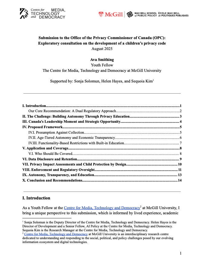 All Reports Submission to the Office of the Privacy Commissioner of Canada (OPC): Exploratory consultation on the development of a children’s privacy code August 2025 Read more → What Should the CBC Be? July 2025 Read more → Deliberative Approaches to Inclusive Governance: An Essay Series Part of the Democratic Legitimacy for AI Initiative April 2025 Read more → Canada’s News Bargaining Code: An Unabridged Account of C-18 April 2025 Read more → Climate Obstruction: On the State and Spread of Climate Disinformation in Canada January 2025 Read more → Climate Justice and Technology Essay Series June 2024 Read more → Do We Need the CBC? October 2024 Read more → 2023 Youth Assembly on Digital Rights and Safety: Recommendations to promote the safety, well-being and flourishing of Canadian youth online September 2023 Read more → Final Report 2022: How to Make Online Platforms More Transparent and Accountable to Canadian Users May 2022 Read more → Platform Governance Essay Series / Gouvernance des plateformes : Série de rédactions Read more →