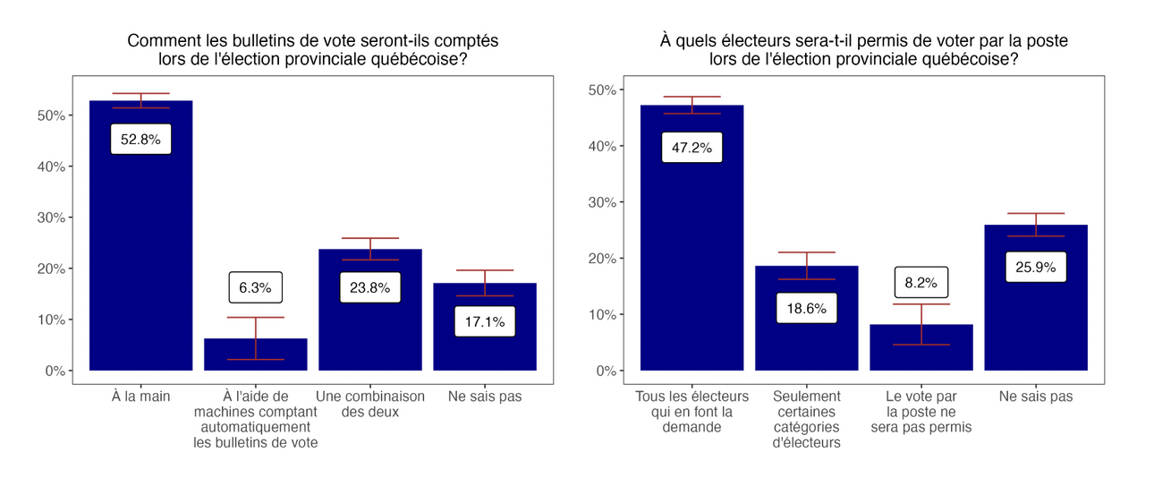 De manière générale, ces narratifs ne semblent pas refléter des croyances profondes, mais plutôt un manque de connaissances quant à l’administration électorale au Québec. Les données de notre sondage révèlent, par exemple, que près de la moitié des électeurs (47.2%) ne savent pas que tous les bulletins de vote sont comptés à la main au Québec. Similairement, moins d’un électeur sur cinq (18.6%) sait que le vote par la poste ne sera permis qu’à certaines catégories d’électeurs lors de la présente élection (voir Figure 6). Ce manque de connaissances sur le processus électoral ouvre la porte à la circulation de fausses informations sur l'administration de l’élection. Il est à noter que les élections au Canada sont réputées par les experts comme étant parmi les plus fiables à travers le monde.