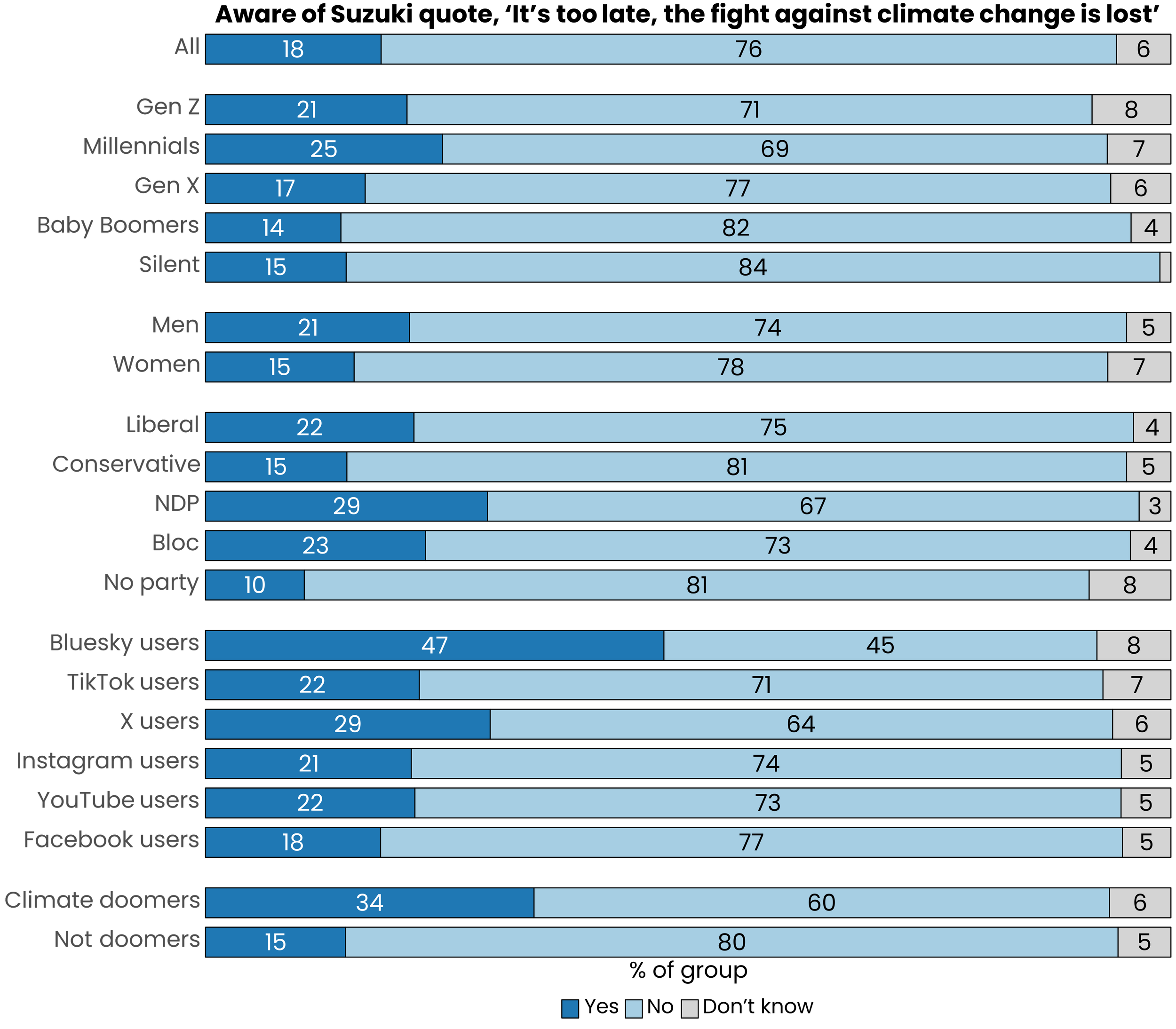 11-12% of Canadians identify as climate doomers, meaning they think climate action no longer matters and it is too late to make a difference. When you look at breakdowns by social media use, up to 37% of Bluesky users are climate doomers.